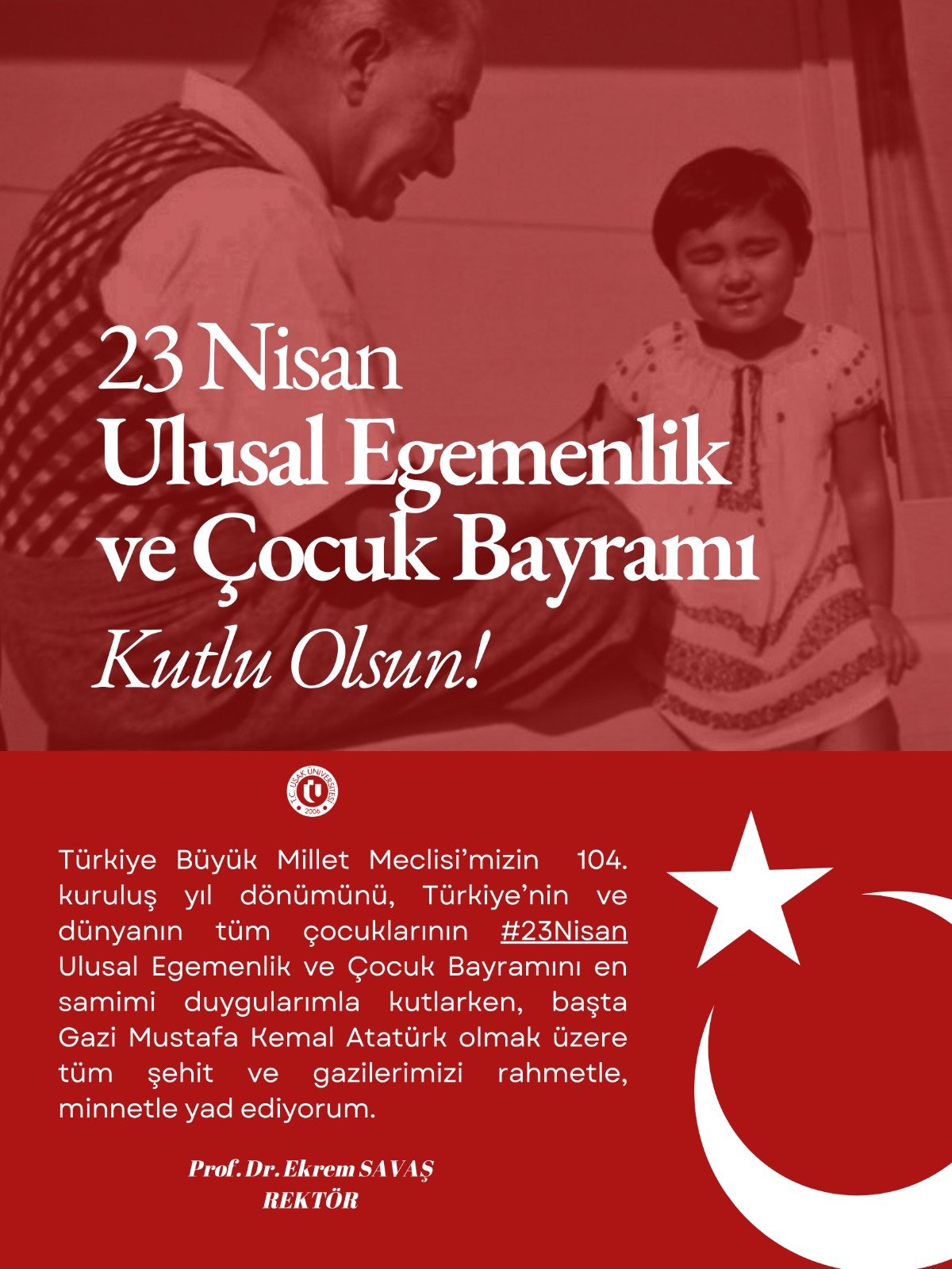 Ana Sayfa / Duyurular / Rektörümüz Prof. Dr. Ekrem SAVAŞ’ın 23 Nisan Ulusal Egemenlik ve Çocuk Bayramı Mesajı