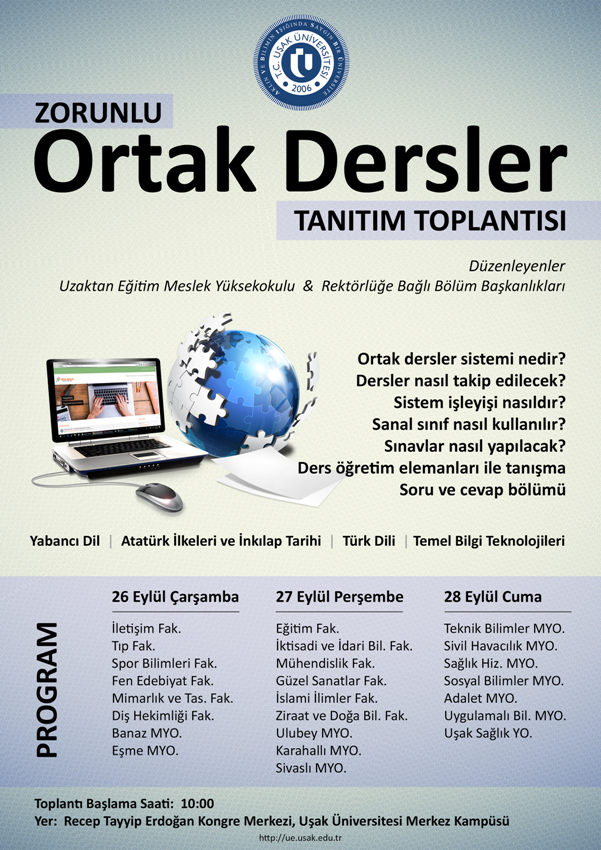 Uzaktan Eğitim Meslek Yüksekokulu tarafından 26-27-28 Eylül 2018 tarihlerinde"Ortak Dersler Sistemi Tanıtım Toplantısı" yapılacaktır.