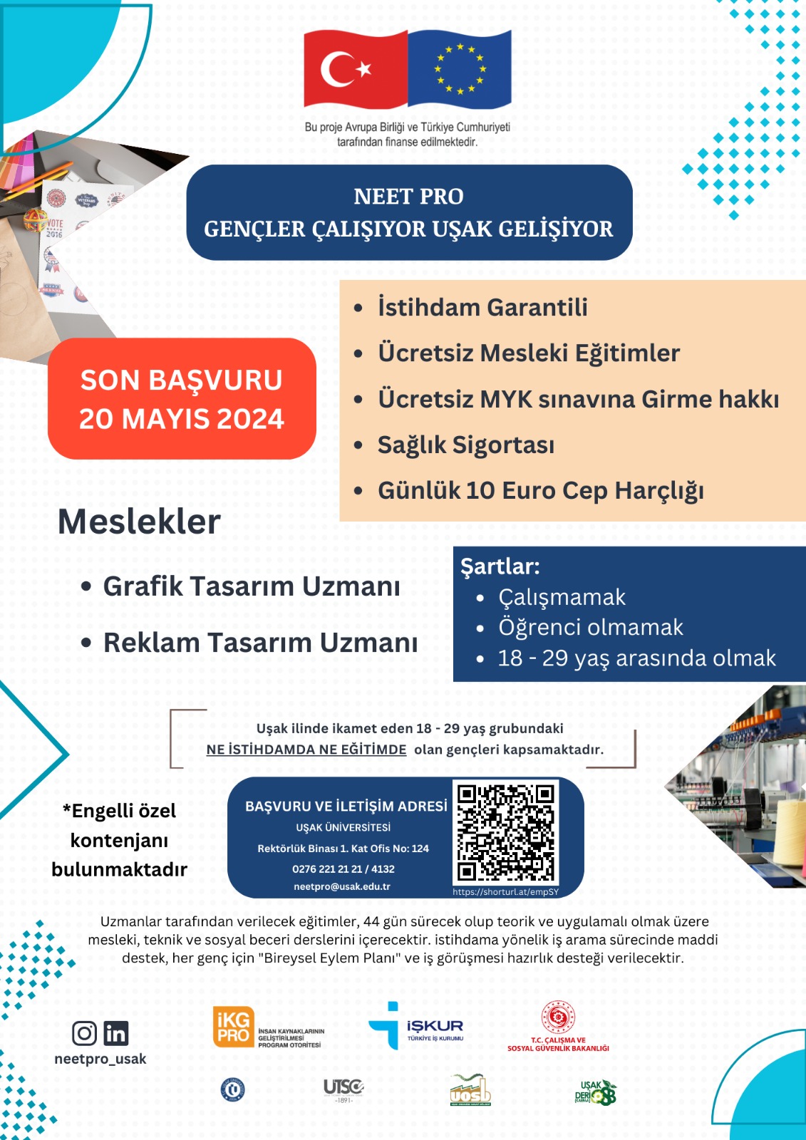 Uşak Üniversitesinin yürütücüsü olduğu “NEET PRO Gençler Çalışıyor Uşak Gelişiyor", gençlerin işgücü piyasasına entegrasyonunu sağlamak ve nitelikli işgücü oluşturmak amacıyla hayata geçirilen özel proje kapsamında 20 gencin “Kursiyer” başvuruları başlamış olup 20 Mayıs 2024 saat 23.59'a kadar başvurular devam edecektir.