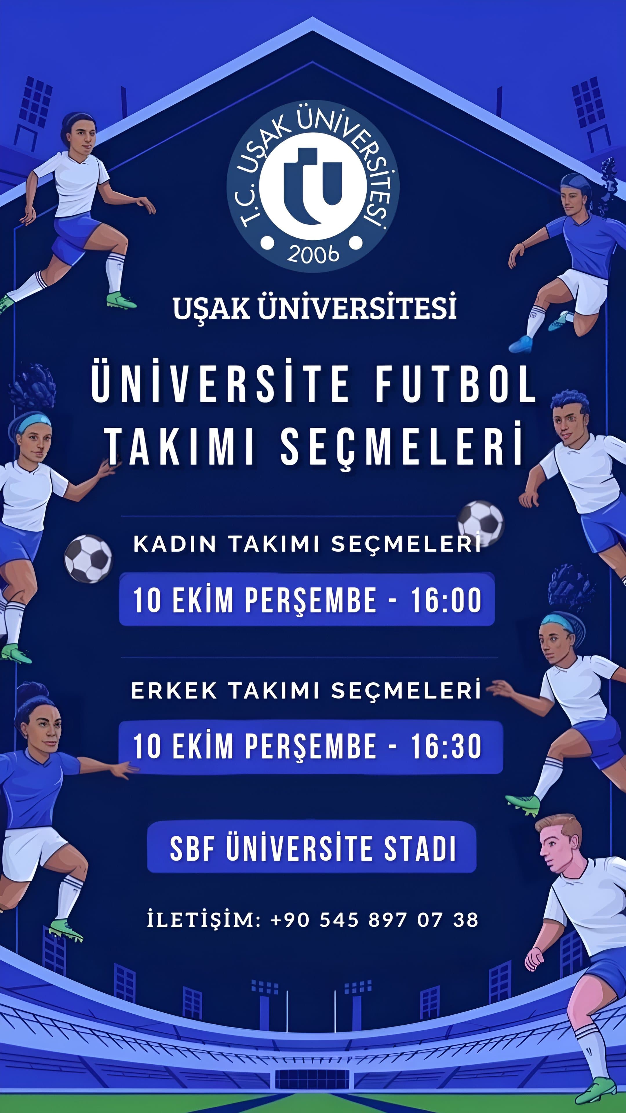 Uşak Üniversitesi Futbol Takım Seçmeleri 10 Ekim 2024 tarihinde yapılacaktır. Kadın Futbol Takım seçmeleri 10 Ekim Perşembe 16:00'da, Erkek Futbol Takım seçmeleri 10 Ekim Perşembe 16:30'da Uşak Üniversitesi Stadında gerçekleştirilecektir.
