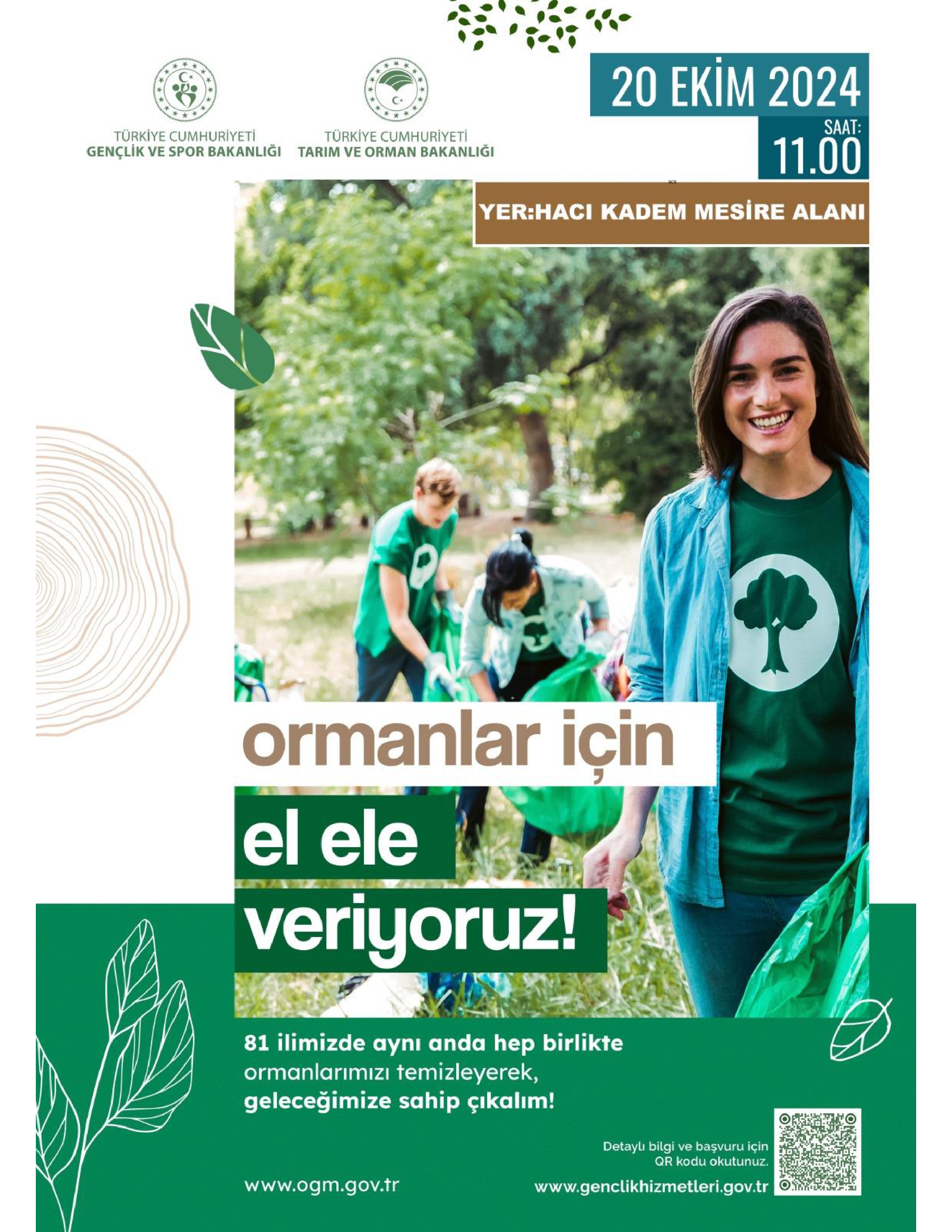 16/10/2024 Ormanlar İçin Elele Koordinasyon Kurulu Toplantısında 81 İlimizde Eş Zamanlı Yapılacak Orman Temizliği Etkinliği kapsamında '' Gençlik ve Spor Bakanlığı Gençlik Hizmetleri Genel Müdürlüğü, Tarım ve Orman Bakanlığı Orman Genel Müdürlüğü iş birliği ile 81 ilde gençlerin katılımıyla 20 Ekim 2024 tarihinde saat 11:00'de Orman Genel Müdürlüğü tarafından belirlenen ormanlık alanlarda ( https://genclikhizmetleri.gov.tr/wp-content/uploads/2024/10/Orman-Alanlar-ve-Irtibat-Kisileri.pdf )eş zamanlı olarak orman temizliği faaliyeti yapılacaktır.''