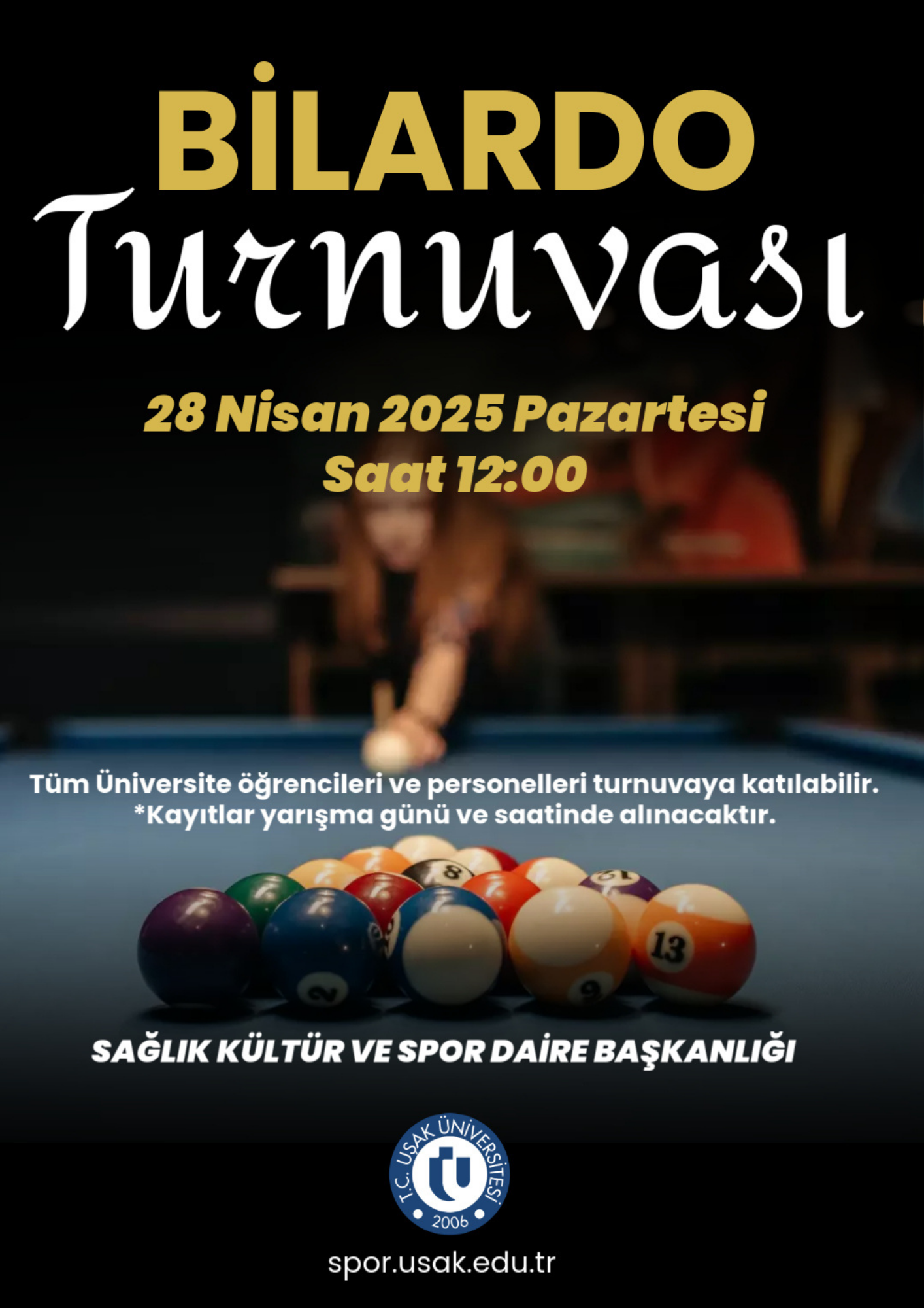 28 Nisan Pazartesi günü tüm üniversite öğrenci ve personelinin katılabileceği Bilardo Turnuvası yapılacaktır.