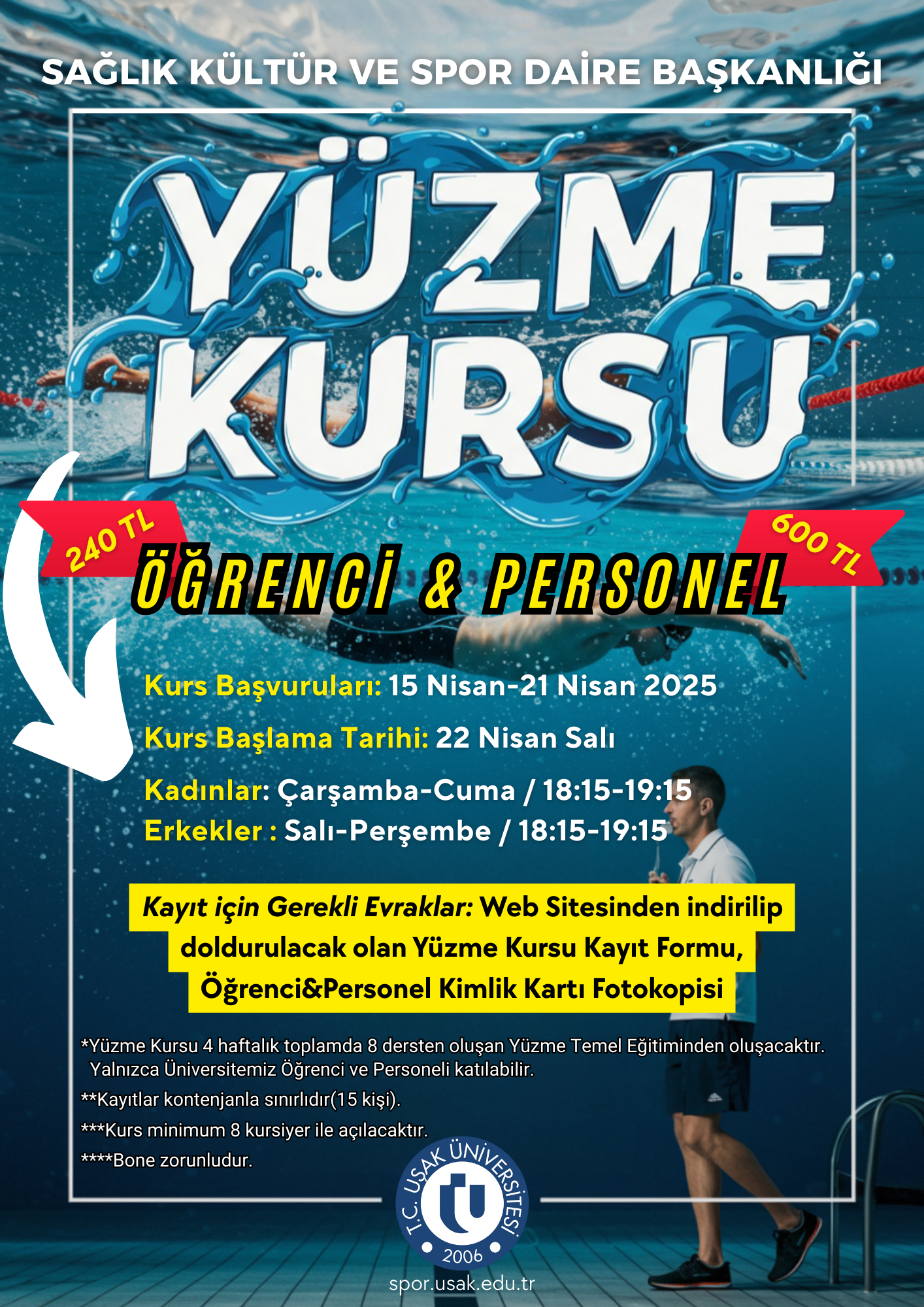 Üniversitemiz Öğrenci ve Personeline yönelik olarak yapılması planlanan Yüzme Kursu başvuruları alınmaya başlamıştır. 22 Nisan Salı günü başlayacak olan Yüzme Kursuna aşağıdaki belgeleri Şehit Ömer Halisdemir Spor Merkezine 21 Nisan Pazartesi gününe kadar teslim edilerek kayıt olunabilir.