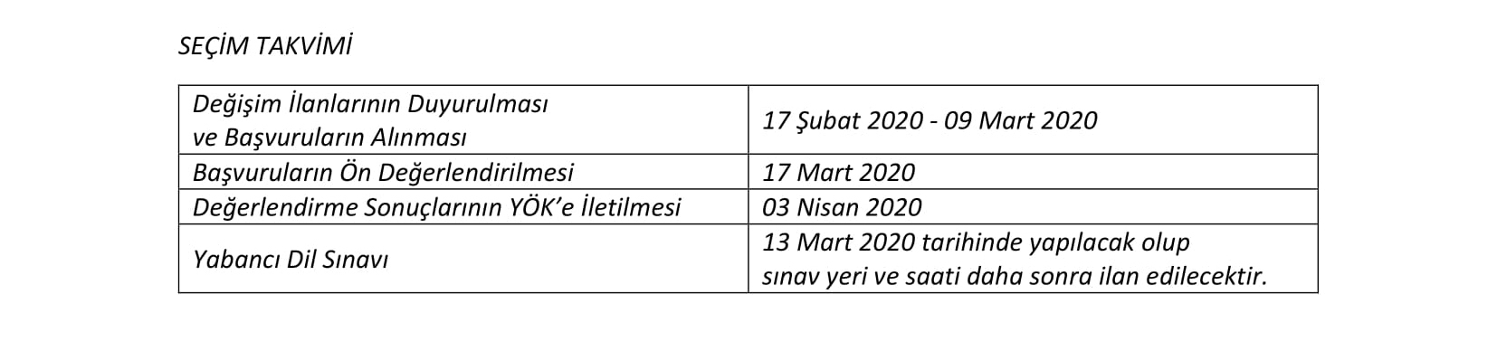 - Öğrenciler gitmek istedikleri dönemi başvuru formunda belirtmelidir. 2020-2021 Akademik Yılı için başka bir seçim dönemi şu an için planlanmamıştır. Y.Ö.K. Başkanlığı gerekli gördüğü takdirde ilana tekrar çıkılabilir.