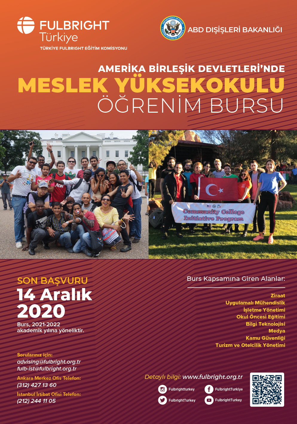 Meslek Yüksekokulu Öğrenim Bursu, Türkiye’deki meslek yüksekokullarının belirli bölümlerinde okuyan öğrencilerin, Amerika Birleşik Devletleri’nde “Community College” adı verilen yüksek öğrenim kurumlarında, bir yıl ders almalarını ve bir yılın sonunda Türkiye’ye dönmelerini amaçlamaktadır. 2007 yılında başlatılan burs programımız, Türkiye’de meslek yüksekokullarında okuyan öğrencilere Amerika Birleşik Devletleri’nde eğitim görmek üzere burs veren tek burs programıdır.