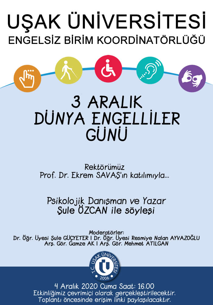 Uşak Üniversitesi Engelsiz Birim Koordinatörlüğü tarafından 3 Aralık Dünya Engelliler Günü kapsamında; 4 Aralık 2020 Cuma günü saat 16.00'da çevrimiçi etkinlik gerçekleştirilecektir.