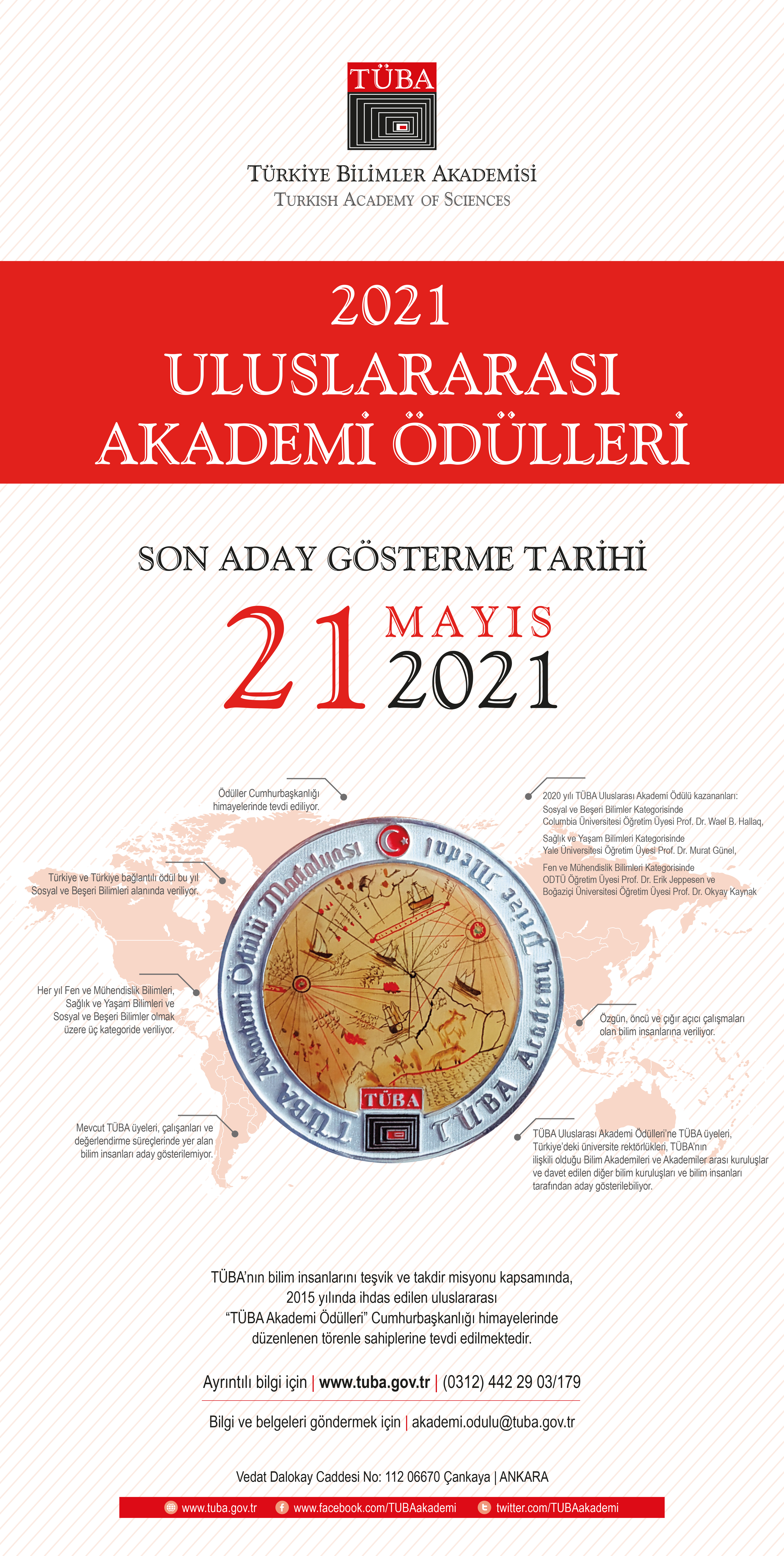 2021 TÜBA Uluslararası Akademi Ödülleri aday gösterme süreci başlamıştır. Akademi Başkanımız Prof. Dr. Muzaffer ŞEKER’in 2021 TÜBA Uluslararası Akademi Ödüllerine ilişkin mektubu, aday gösterme formu, Ödül Esasları, afiş ve bilgi broşürü ekte gönderilmektedir. Son aday gösterme tarihi 21 Mayıs 2021’dir.
