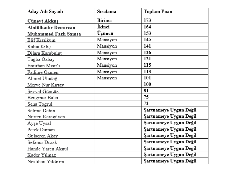 “Dil ve imla”, “üslup”, “kompozisyon”, “konu” ve “orijinallik” kriterlerine göre değerlendirilen eserler hakkındaki puan listesi ve puanlara göre sıralama aşağıda yer almaktadır.