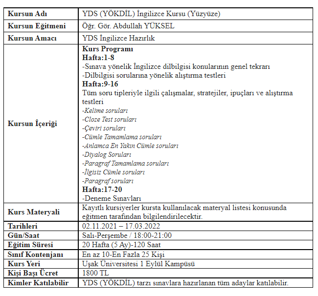 * Sürekli Eğitim Araştırma ve Uygulama Merkezi bünyesinde “YDS (YÖKDİL) İngilizce Kursu” düzenlenecektir. Kursa başvurmak isteyenler 25 Ekim 2021 tarihine kadar aşağıda yer alan kursiyer ön başvuru formunu doldurarak usem@usak.edu.tr mail adresine gönderebilirler. Kurs ücreti ödeme tarihleri daha sonra kursiyerlere bildirilecektir.