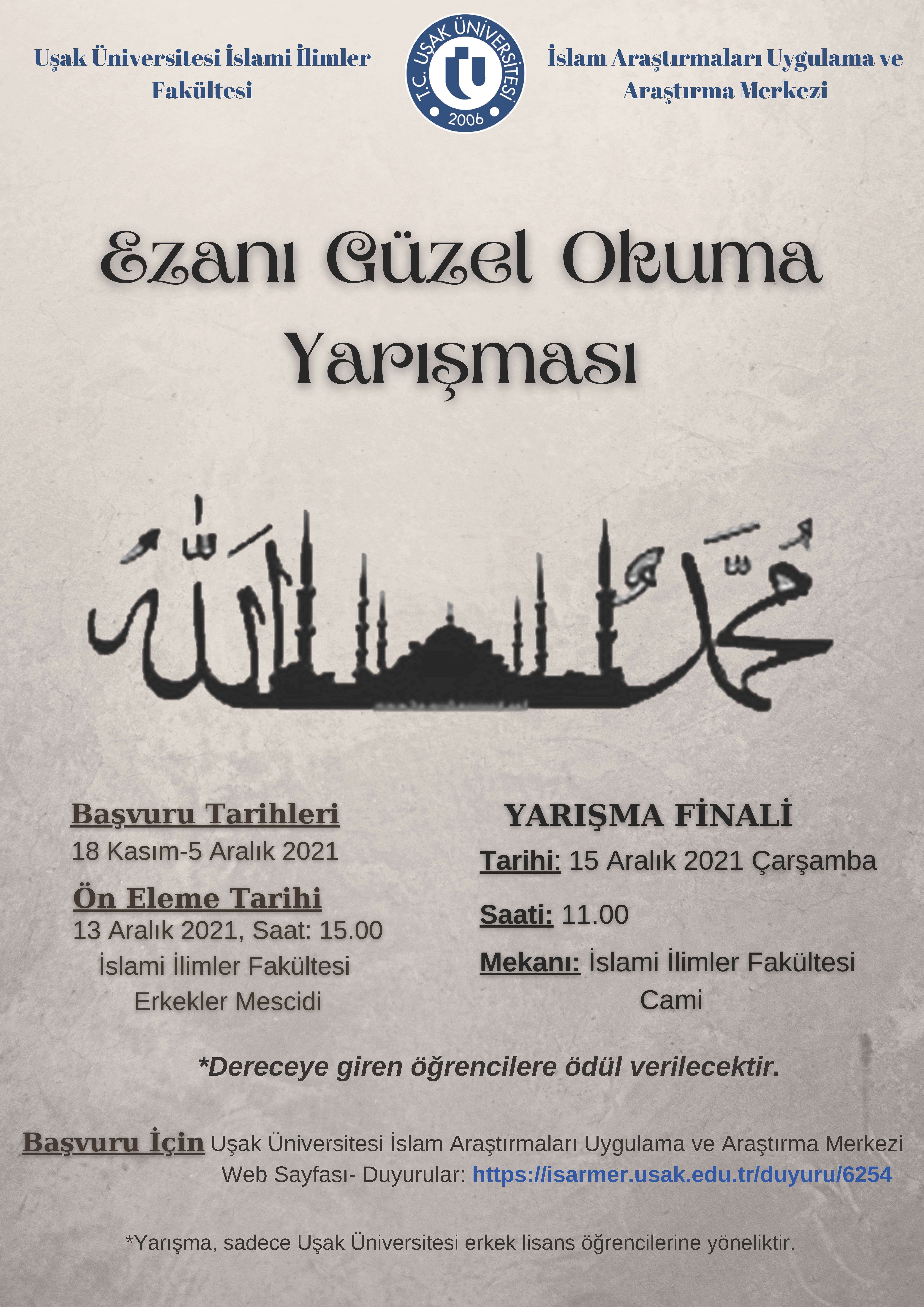 İslam Araştırmaları Uygulama ve Araştırma Merkezi Müdürlüğü tarafından organize edilen ve İslami İlimler Fakültesi İle işbirliği halinde yapacağımız Ezanı Güzel Okuma Yarışması, 15 Aralık 2021 Çarşamba günü saat 11.00’da İslami İlimler Fakültesi Uygulama Camiinde, Yarışma Finali programı düzenlenecektir. Üniversitemiz Akademik ve İdari Personeller ile Öğrencilerimizi yarışmayı izlemeye davet ediyoruz. Sizleri aramızda görmekten onur duyarız.