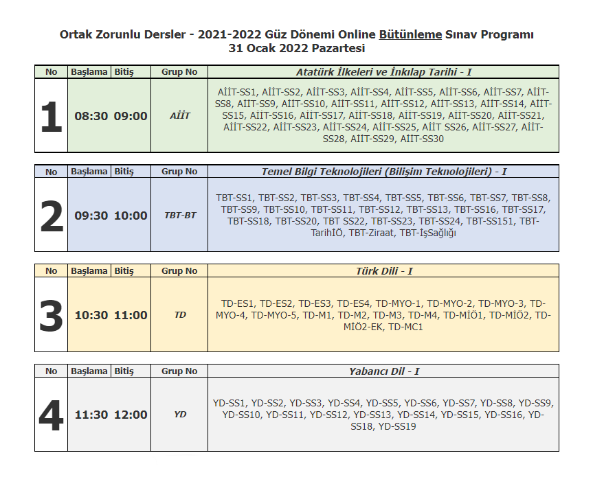 Ortak Zorunlu Dersler (Türk Dili-I, Atatürk İlkeleri ve İnkılap Tarihi-I, Temel Bilgi Teknolojileri / Bilişim Teknolojileri-I, Yabancı Dil-I dersleri) 2021 - 2022 güz yarıyılı bütünleme sınavları https://uzem.usak.edu.tr/duyuru/6101#butunleme_sinavi adresinde belirtilen gün ve saatlerde tek grup çevrimiçi (online) olarak https://udks.usak.edu.trüzerinden gerçekleştirilecektir.
