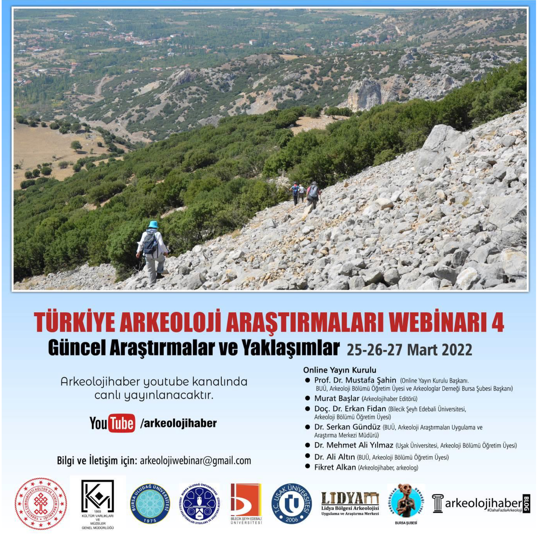 Bu webinarların dördüncüsü olan ‘Türkiye Arkeoloji Araştırmaları Webinarı’ Kültür ve Turizm Bakanlığı, Kültür Varlıkları ve Müzeler Genel Müdürlüğü’nün destekleriyle ve Uşak Üniversitesi, Lidya Bölgesi Arkeolojisi Uygulama ve Araştırma Merkezi, Bursa Uludağ Üniversitesi, Arkeoloji Araştırmaları Araştırma ve Uygulama Merkezi, Bilecik Şeyh Edebali Üniversitesi, Arkeologlar Derneği Bursa Şubesi ve Arkeolojihaber işbirliğinde gerçekleştirilecektir. Güncel Araştırmalar ve Yaklaşımlar temalı webinar 25-27 Mart 2022 tarihleri arasında arkeolojihaber YouTube (www.youtube.com/arkeolojihaber) kanalından canlı olarak yayınlanacaktır.