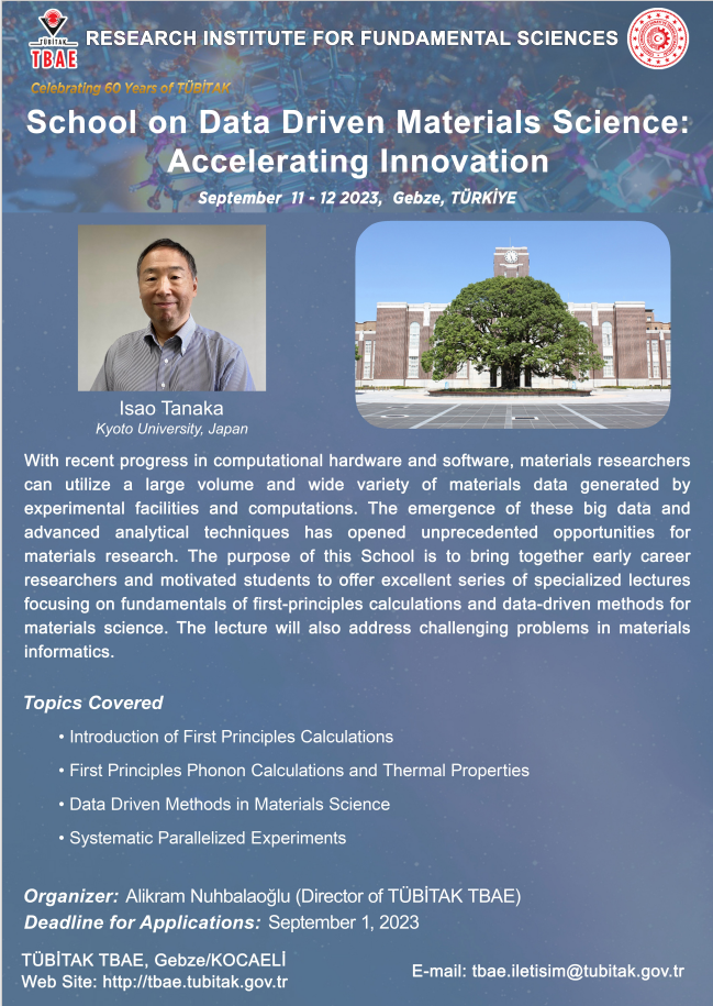 TÜBİTAK-Temel Bilimler Araştırma Enstitüsü (TBAE) Malzeme Bilimi Yaz Okulu Gebze, TÜRKİYE Temel Bilimler Araştırma Enstitüsü, temel bilimin çeşitli dallarında ve disiplinler arası alanlarda oldukça geniş bir yelpazede nitelikli bilgi üretmek, uluslararası düzeyde bilimsel etkinlikler gerçekleştirmek ve Türkiye’ye bilimsel rekabet gücü kazandırmak yönündeki çabalarını Cumhuriyetimizin 100’üncü Yılı ve TÜBİTAK’ın 60’ıncı Kuruluş Yılı münasebetiyle arttırarak devam ettirmektedir. Bu kapsamda, 11-12 Eylül 2023 tarihleri arasında “Data Driven Materials Science: Accelerating Innovation” konulu uluslararası bir Yaz Okulu düzenlenecektir.