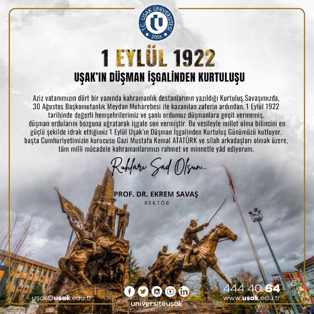 Ana Sayfa / Duyurular / Rektörümüz Prof. Dr. Ekrem SAVAŞ'ın Uşak’ın Düşman İşgalinden Kurtuluş Günü Mesajı