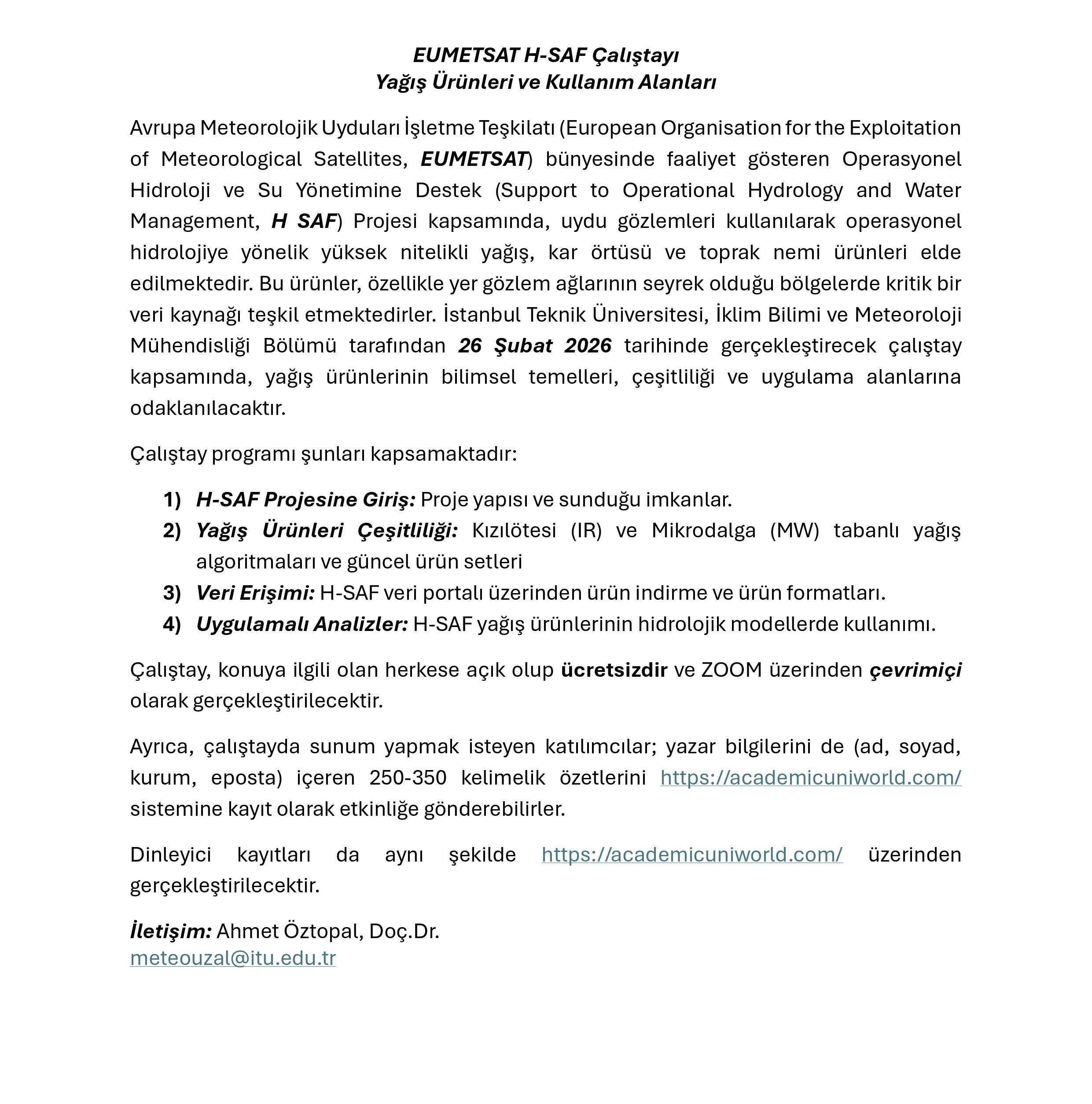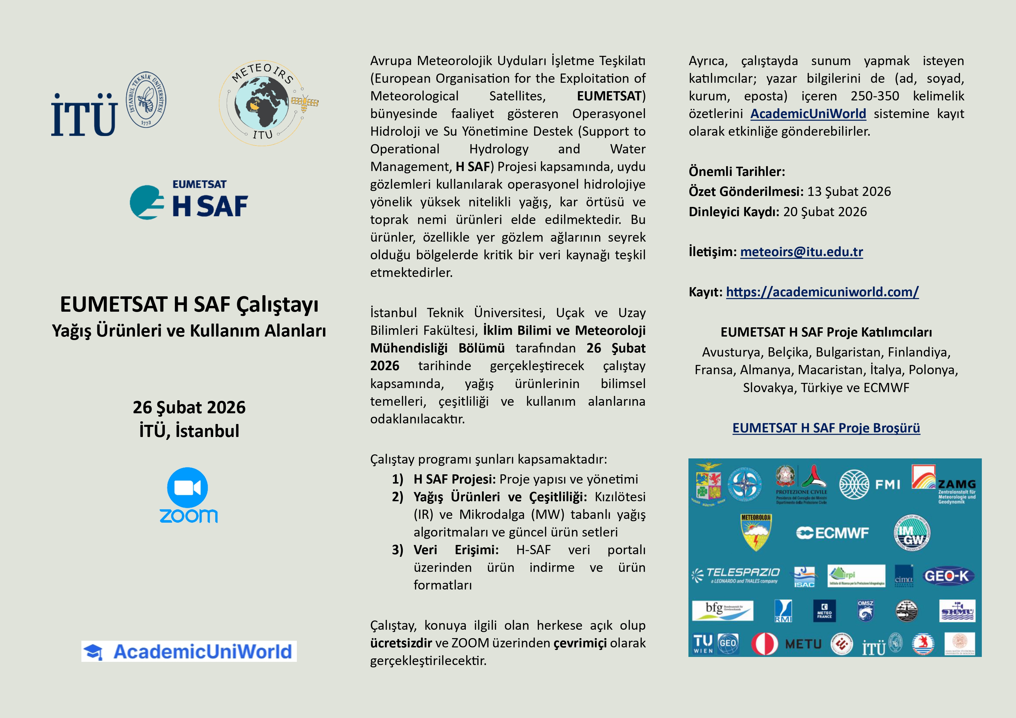 29 Ocak 2026, Perşembe "EUMETSAT H-SAF" Çalıştay Duyurusu