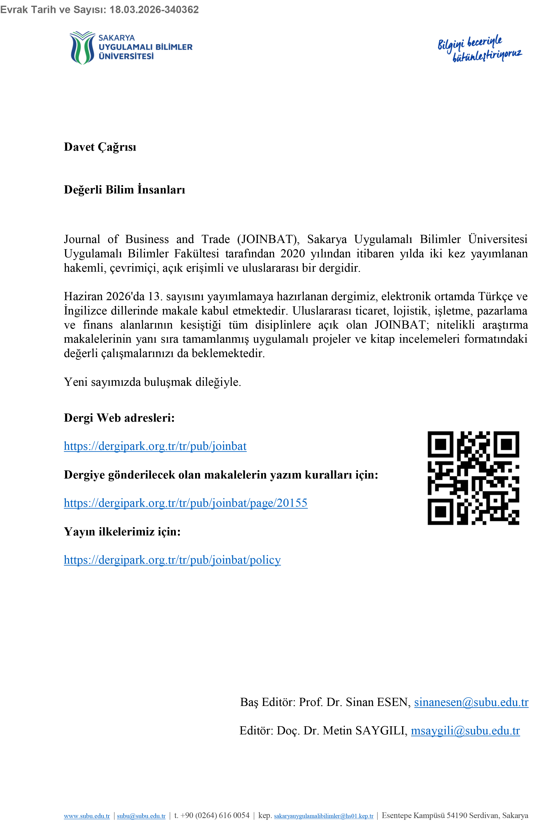 19 Mart 2026, Perşembe Journal of Business and Trade Makale Çağrısı