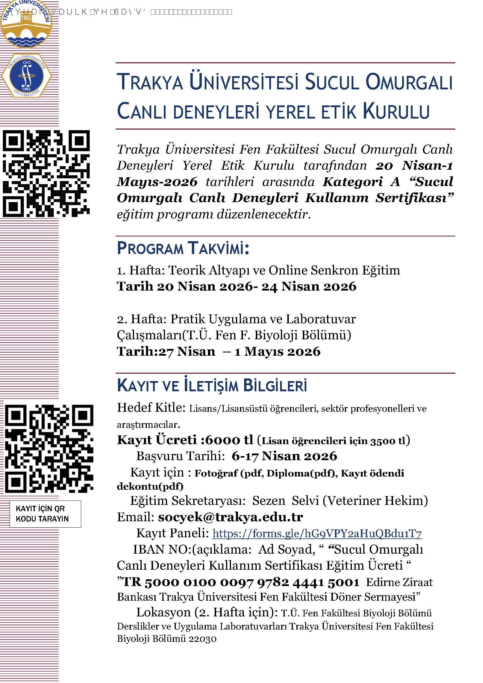13 Nisan 2026, Pazartesi Kategori A "Sucul Omurgalı Canlı Deneyleri Kullanım Sertifikası" Hk