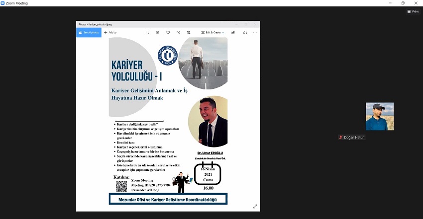 Uşak Üniversitesi Mezunlar Ofisi ve Kariyer Geliştirme Koordinatörlüğü tarafından, Çanakkale Onsekiz Mart Üniversitesi Öğretim Üyesi Dr. Umut Eroğlu’nun konuşmacı olarak yer aldığı, "Kariyer Yolculuğu-I, Kariyer Gelişimini Anlamak ve İş Hayatına Hazır Olmak" isimli çevrimiçi etkinlik gerçekleştirildi.