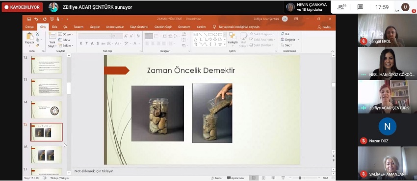 Zaman yönetimi ile ilgili bilgiler veren Doç. Dr. Zülfiye Acar Şentürk, iyi bir zaman yönetiminin iyi bir planlama gerektirdiğini ifade ederek, öncelikleri doğru belirlemek gerektiğinin altını çizdi. Zamanı iyi değerlendirmenin önemini anlatan Şentürk, kaliteli zaman geçirmek için de zaman yönetimini doğru yapmak gerektiğini sözlerine ekledi.