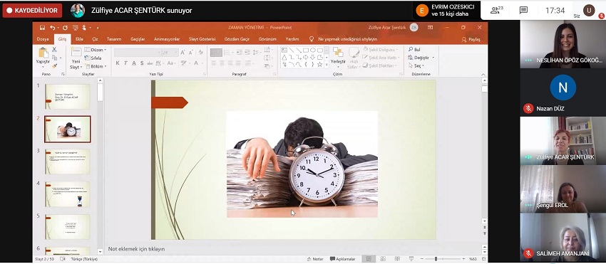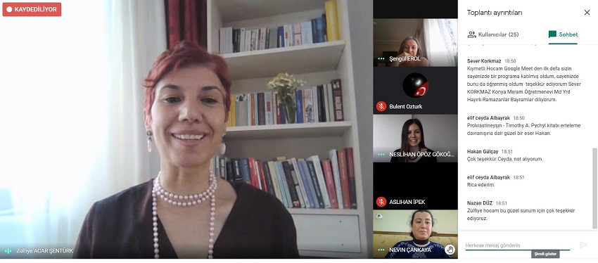 Uşak Üniversitesi Güzel Sanatlar Fakültesi tarafından, Moderatörlüğünü Öğr. Gör. Neslihan Öpöz Gökoğlan’ın yaptığı ve Doç. Dr. Zülfiye Acar Şentürk’ün konuşmacı olarak katıldığı “Zaman Yönetimi” konulu eğitim konferansı çevrimiçi olarak gerçekleştirildi.