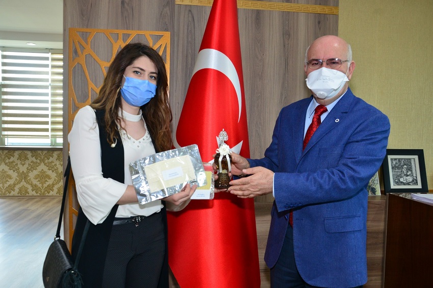Uşak Üniversitesi Rektörü Prof. Dr. Ekrem Savaş, TÜBİTAK Stajyer Araştırmacı Burs Programı (STAR) bursiyeri Nesibe Özge Toy’u makamında ağırladı. TÜBİTAK STAR Programı Kovid-19 Araştırma Projeleri Çağrısı kapsamında, yürütücülüğünü Ziraat Fakültesi Öğretim Üyesi Prof. Dr. Nuray Şahinler’in yaptığı ve Lisansüstü Eğitim Enstitüsü Zootekni Anabilim Dalında doktora öğrencisi olan Nesibe Özge Toy, yürüttükleri projeyle ilgili Prof. Dr.Ekrem Savaş’a bilgi verdi.