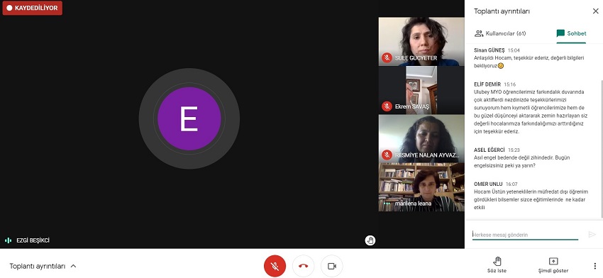 Engellile Farkındalık Haftası etkinlikleri kapsamında online ‘Farkındalık Duvarı’ oluşturduklarını anlatan Dr. Öğretim Üyesi Ayvazoğlu, farkındalık duvarına yazılan mesajları okudu. Engelsiz Birim Koordinatörü Dr. Güçyeter’in soruları eşliğinde Doç. Dr.Leana-Taşcılar, ‘İki Kere Farklı Bireyler’ hakkında bilgi verdi.