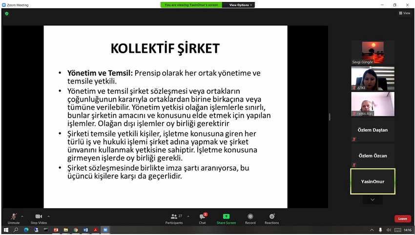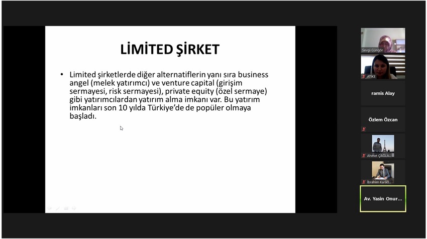 Avukat Yasin Demirci’nin konuk olduğu etkinlikte; şahıs şirketi, limited ve anonim şirketleri, komandit şirket ve kollektif şirket gibi şirket türleri ile ilgili bilgi verildi. Ayrıca girişimcilik hukuku, start-up şirketler ve girişimcilik finansmanı konularının da konuşulduğu etkinlik, UTTO Koordinatörü Öğr. Gör. Dr. Atike İnce Yardımcı’nın Av. Yasin Demirci ve katılımcılara teşekkürü ile son buldu.