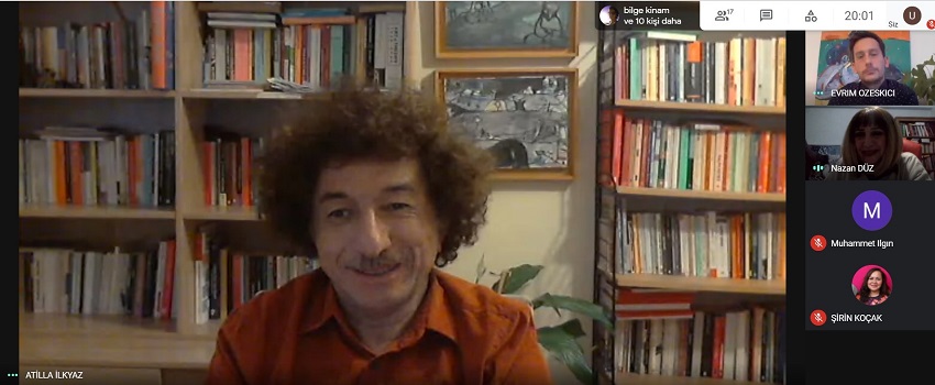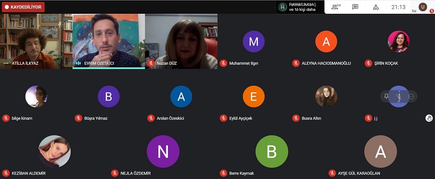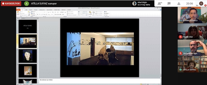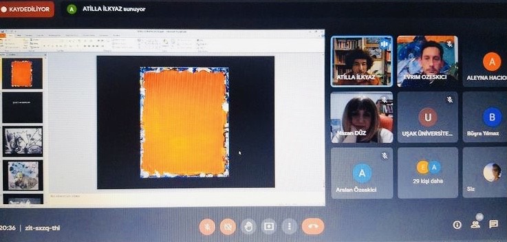 Moderatörlüğünü Doç. Evrim Özeskici’nin üstlendiği online (çevrimiçi) söyleşide, Ankara Hacı Bayram Veli Üniversitesi Sanat ve Tasarım Fakültesi Görsel Sanatlar Bölümü Öğretim Üyesi Prof. Atilla İlkyaz konuşmacı olarak yer aldı. Yoğun ilgi gören söyleşide, Güzel Sanatlar Fakültesi Dekanı Prof. Dr. Şebnem Ruhsar Temir Gökçeli ve Resim Bölüm Başkanı Doç. Dr. Nazan Düz bu etkinliğin gerçekleşmesinden dolayı mutluluk duyduklarını belirterek, Prof. Atilla İlkyaz’a teşekkürlerini sundular.