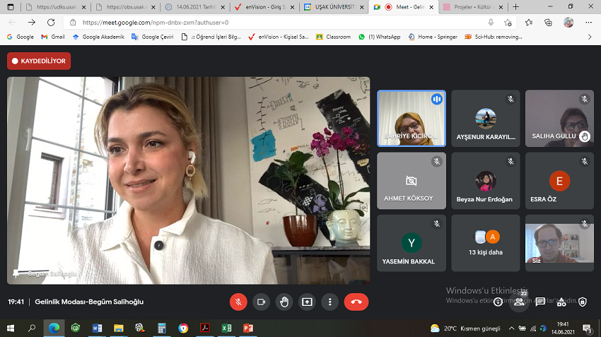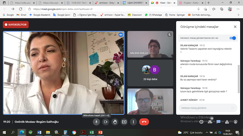 Moderatörlüğünü Öğr. Gör. Murat Yıldız’ın yaptığı söyleşiye Begüm Salihoğlu konuşmacı olarak katıldı. Farklı bir alanda lisans eğitimini alırken hocasının yönlendirmesiyle moda tasarım bölümüne geçen Begüm Salihoğlu; gelinlik tasarım mağazasını açana kadar yaşadığı zorluklardan ve atölyeyi açma hikâyesinden bahsetti. Atölyesini açtığı ilk günden bugüne her yıl sektöre yenilikler katmaya devam etmesinin anahtarının sürekli araştırmaktan geldiğini belirten Salihoğlu gelinlik modasını anlattı.