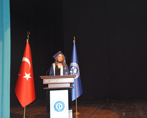 Gösterimin ardından, mezun öğrenciler adına dönem birincisi İktisadi ve İdari Bilimler Fakültesi öğrencisi Raziye Akarca bir konuşma yaptı. Akarca, öğrenci olmanın yanı sıra iki çocuk annesi olmanın gururunu taşıdığını belirterek ‘‘Müsaadenizle sizlere kısaca kendi hikâyemden bahsetmek isterim. Ben eğitim hayatıma uzun yıllar ara vermek zorunda kaldım. Öğrenci olmanın yanı sıra iki çocuk annesi olmanın gururunu taşıyorum. Eğitimin önemini bildiğim için, eğitimli bir anne olabilmek için öğrenmekten ve okumaktan hiç vazgeçmedim. Sosyal Hizmet Bölümü’nü okumadan önce Sosyal Güvenlik Bölümü’nden mezun oldum. Sosyal Güvenlik Bölümü’nü okumak benim hedeflerimden biriydi. Bu bölümden çok fazla şey öğrendim. Ancak eğitimimi 4 yıla tamamlamak için devam ettiğimde anladım ki öğrenecek daha çok fazla şey varmış. Şu anda memur olarak görev yapsam da yüksek lisans eğitimi almak için de çalışmaya devam edeceğim çünkü öğrenmenin asla bitmeyen bir süreç olduğuna inanıyorum. Bizim başarılarımız ülkemizin başarıları olacaktır. Dünyayı değiştirecek en büyük güç eğitimdir. Bunun için inancımızı kaybetmeden çalışmalıyız ki geleceğe güvenle bakabilelim. Bizler Uşak Üniversitesi’nin yani “Aklın ve Bilimin Işığında Yeni Nesil Bir Üniversite”nin mensubu olmanın, bu ailenin bir parçası olmanın gurur ve mutluluğunu yaşıyoruz. Bu ailenin bize kazandırdığı donanım, tecrübe ve değerler, vatan ve millet aşkıyla ülkemize hizmet ederken en büyük yardımcımız olacaktır. Ben Sözlerimi tamamlarken, Uşak Üniversitesinde eğitim-öğretim hayatımız boyunca huzurlu ve güvenli bir şekilde öğrenim görmemizi sağlayan, başta Sayın Rektörümüz Prof. Dr. Ekrem Savaş ve üniversite yönetimi olmak üzere, bizlere yol gösteren çok değerli hocalarımıza ve üniversitemizin idari personeline emeklerinden dolayı teşekkür etmek isterim. Üzerimizdeki hiçbir emeği boşa çıkarmadan topluma ve insanlığa faydalı kişiler olabilmemizi diliyorum ve tabi ki her zaman yanımda olan ve desteklerini esirgemeyen değerli aileme teşekkür ediyorum. Mezun olan tüm arkadaşlarıma mesleki hayatlarında başarılar diliyor, beni dinlediğiniz için hepinize teşekkür ediyorum.’’ dedi.