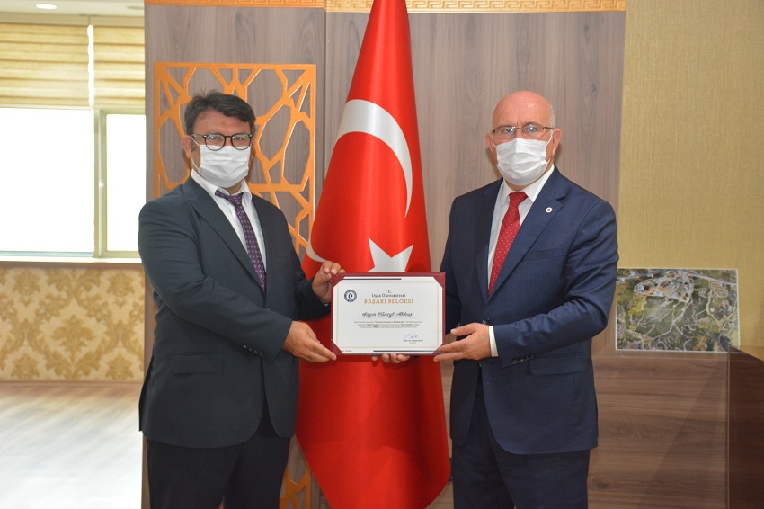 Yarışmada birinci olan Cüneyt Akkuş’u, rektörlük makamında kabul eden Prof. Dr. Savaş, Akkuş’u tebrik ederek, başarı belgesini verdi.