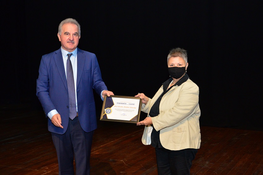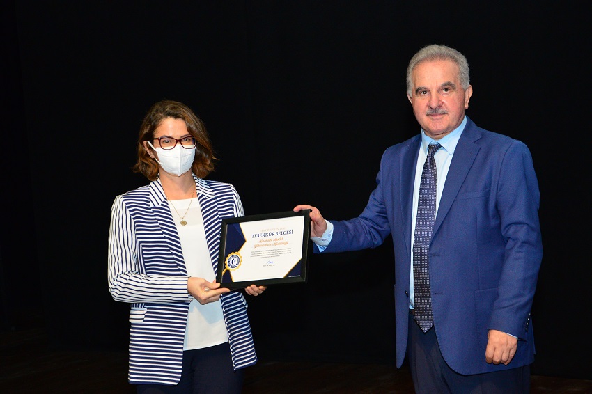 ISO Yönetim Sistemleri Belgeleri takdiminin ardından, 2020 yılı Akademik Birim Öz Değerlendirme çalışmaları kapsamında yapılan derecelendirme sonucunda fakültelerimiz arasında ilk sırada yer alan Güzel Sanatlar Fakültesi Dekanı Prof. Şebnem Ruhsar Temir Gökçeli’ye, Meslek Yüksekokulları arasında ilk sırada yer alan Karahallı Meslek Yüksekokulu Müdürü Doç. Dr. Ayşenur Tarakçıoğlu Altınay’a teşekkür belgeleri YÖKAK Başkanı Prof. Dr. Muzaffer Elmas tarafından verildi.