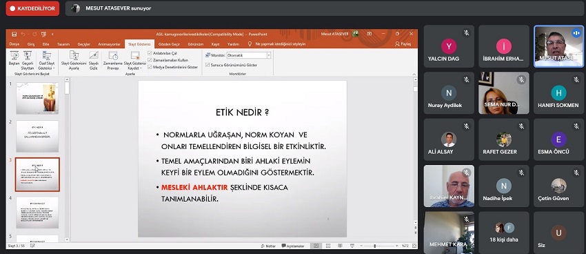 Eğitimde; etik nedir, etik davranış ilkeleri, meslek etiği, etik dışı davranışlar, kamu yönetiminde etik dışı davranışlar ve nedenleri, etik ilke ve değerlere ilişkin mevzuat anlatıldı.