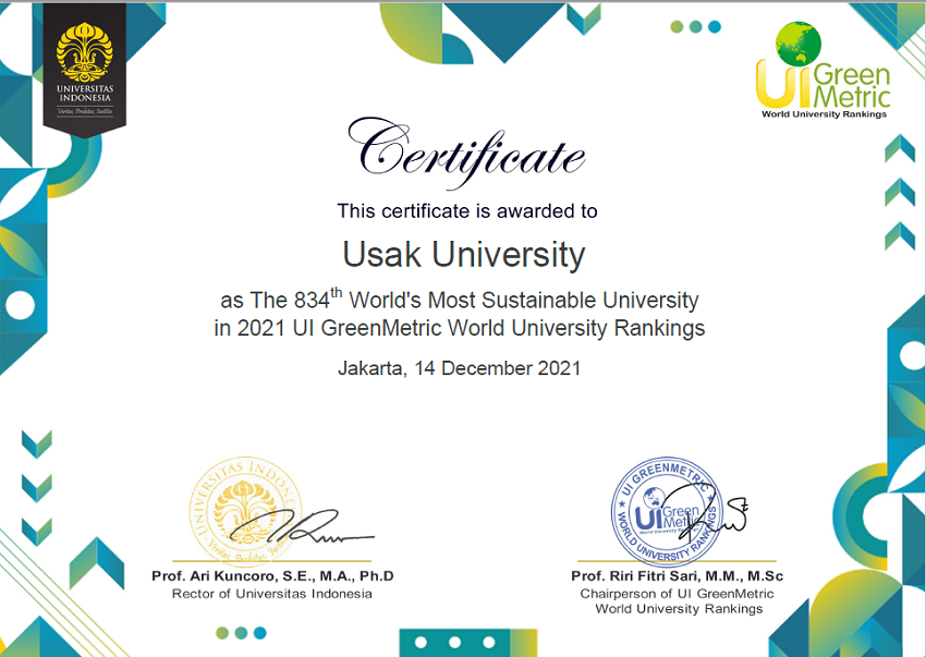 Uluslararası düzeyde 956 üniversitenin sıralamaya dâhil edildiği değerlendirmede, 2021 yılında toplamda 3400 puan alan Uşak Üniversitesi, dünya üniversiteleri arasında yer aldı. Sıralamanın yapı ve alt yapı kategorisinde 975 puan alan üniversitemiz, enerji ve iklim değişikliği kategorisinde 650, atık kategorisinde 300, ulaşım kategorisinde 525, eğitim ve araştırma kategorisinde ise 750 puan alarak, ABD, Rusya ve Avrupa’daki birçok üniversiteyi geride bıraktı.