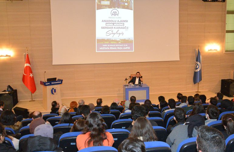 Anadolu Ajansı (AA) Yönetim Kurulu Başkanı ve Genel Müdürü Serdar Karagöz, Uşak Üniversitesi Genç İletişimciler Topluluğu tarafından Mustafa Kemal Paşa Amfisinde düzenlenen söyleşide üniversite öğrencileriyle bir araya geldi.