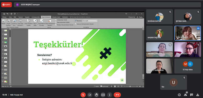 Uşak Üniversitesi Fen Edebiyat Fakültesi Sosyoloji Bölümü tarafından düzenlenen çevrimiçi sosyoloji seminerlerinin altıncısı, üniversitemiz Psikoloji Bölüm Başkanı Dr. Öğretim Üyesi Ezgi Beşikçi'nin "İnsan Deneyiminin Ortak Noktası Olarak Psikolojik Dışlanma: Neleri biliyoruz? Neleri Öğrenmeyi Bekliyoruz? başlıklı konuşmasıyla gerçekleştirildi.
