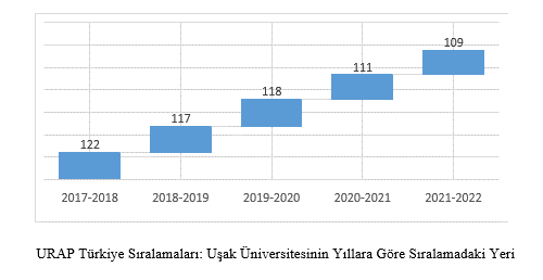URAP (University Ranking by Academic Performance) 2021-2022 World Ranking – Dünya Sıralamasında 76 basamak yükselerek 2678. olmayı başaran Uşak Üniversitesi, Türkiye’den 112 yükseköğretim kurumunun yer aldığı sıralamalarda 14 üniversiteyi gerisinde bıraktı. Ayrıca URAP’ın 2021-2022 Türkiye sıralamalarında 109. olmayı başaran Uşak Üniversitesi, 2000 yılından sonra kurulan devlet üniversiteleri sıralamalarında 108 yükseköğretim kurumu arasında 47. sırada yer aldı.