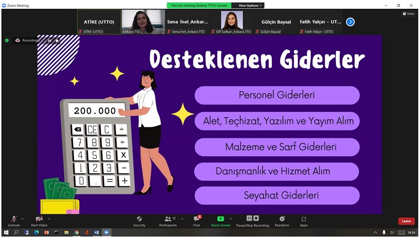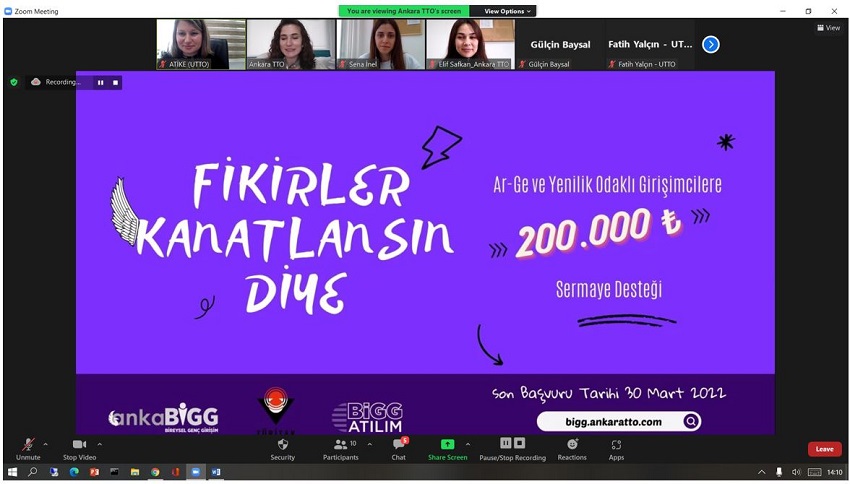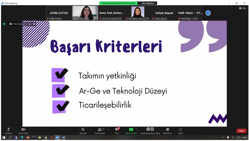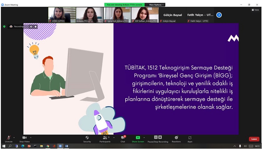Etkinlik, akademisyenlerimiz ve öğrencilerimizin katılımıyla, UTTO Koordinatörü Öğr. Gör. Dr. Atike İnce Yardımcı’nın moderatörlüğünde ve Ankara TTO Girişimcilik Uzman Yardımcısı Gözde Uysal’ın sunumu ile çevrimiçi olarak gerçekleştirildi.