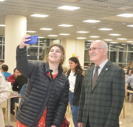 Uşak Üniversitesi Rektörü Prof. Dr. Ekrem Savaş, Rektör Yardımcıları Prof. Dr. M. Murat Öntuğ ile Prof. Dr. Kenan Taş, Ramazan ayının ilk iftarında öğrencilerle birlikte oruçlarını açtılar. Öğrenci Yaşam Merkezinde yer alan yemekhanede incelemelerde bulunan Prof. Dr. Savaş, iftar saatini bekleyen öğrencilerin masalarını gezerek, iftar öncesi onlarla bir süre sohbet etti. Rektör Ekrem Savaş, “Pandemi seyrinin hafiflediği şu günlerde mübarek Ramazan ayında öğrencilerimizle iftar sofralarında yeniden buluşmak ve onlarla ayını masada orucumuzu açmak bizleri çok mutlu ediyor. Bu yılki ilk iftarımızı öğrencilerimizle beraber gerçekleştirmek, onlarla birlikte yemek sırası beklemek ve aynı masada yeniden buluşabilmek geçtiğimiz iki yıllık pandemi süreci düşünüldüğünde paha biçilemez bir nimet. Ramazan ayı vesilesiyle şunları da iletmek istiyorum; kavuştuğumuz Ramazan ayının, tüm Dünya’da yaşanan olumsuzlukların, zulümlerin ve problemlerin çözüldüğü, açlığın, sefaletin ve yoksulluğun son bulduğu bir ay olmasını Yüce Rabbimden niyaz ediyor, tuttuğumuz oruçların ve yaptığımız ibadetlerin kabul olmasını diliyorum. Ramazan-ı Şerif’in Milletimiz, İslam Âlemi ve tüm insanlık için hayırlara vesile olmasını Cenab-ı Hak’tan niyaz ediyorum.” ifadelerini kullandı.