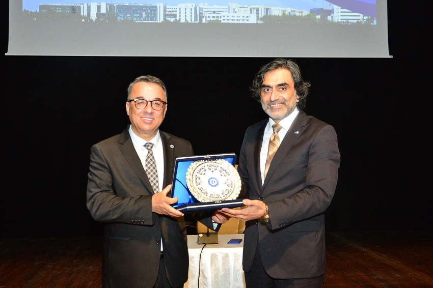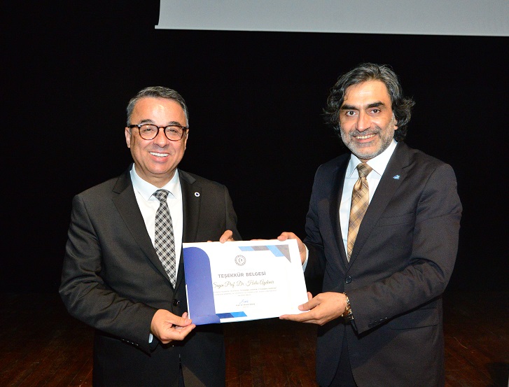 Konuşmasının ardından soruları cevaplayan Prof. Dr. Aydemir’e konferansın sonunda Rektör V. Prof. Dr. Kenan Taş, üniversitemiz adına teşekkür belgesi ve plaket takdim etti.