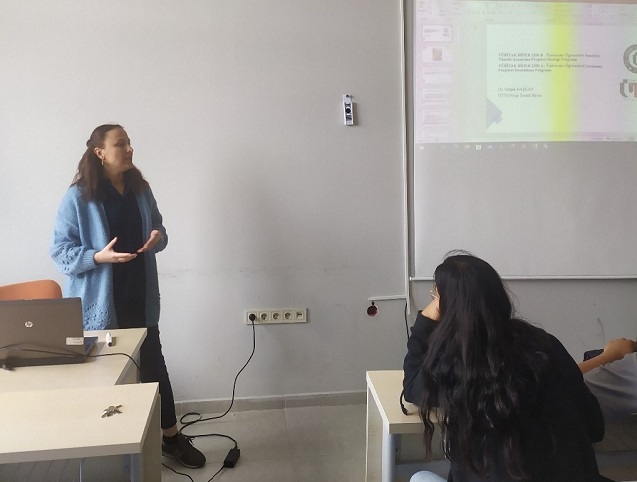 Etkinliğin son bölümünde, UTTO Proje Destek Birimi Öğretim Görevlisi Dr. Gülşah Başkan tarafından, TÜBİTAK 2209-A Üniversite Öğrencileri Araştırma Projeleri Destekleme Programı ve TÜBİTAK 2209-B Üniversite Öğrencileri Sanayiye Yönelik Araştırma Projeleri Destekleme Programı kapsamında destek miktarı, başvuru koşulları, proje ekibinin oluşturulması, başvuru esnasında gerekli belgeler ve proje değerlendirme kriterleri hakkında bilgilendirme yapıldı.