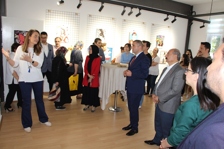 Çalışılacak yüzeye çok çeşitli materyallerin yapıştırılması ya da tutturulmasıyla mevcut konunun aktarılması olarak tanımlanabilecek olan ‘Kolaj Çalışması’ kapsamında öğrencilerin gerçek saç tellerinden, takma tırnağa, cımbızdan, dantele onlarca farklı malzemeyi kullanarak yaptığı 35 eser sergiyi gezenler tarafından ilgiyle karşılandı.