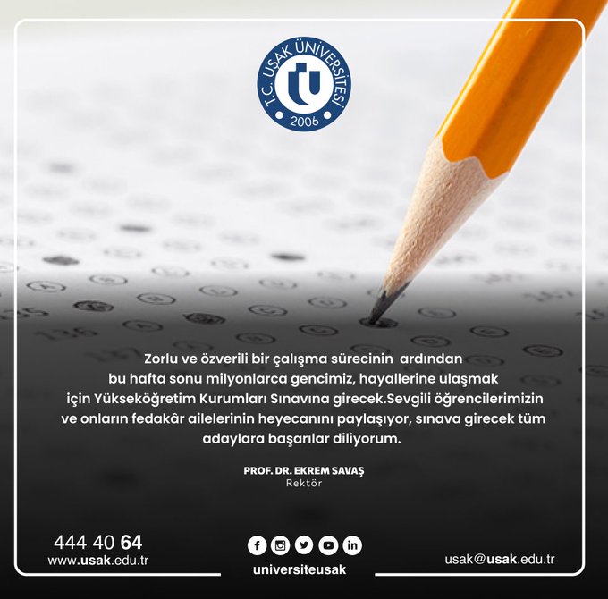 Prof. Dr. Savaş ayrıca, Cuma akşamından itibaren sınav saatleri içinde gürültü kirliliğinin olmaması konusu ve adayların sağlıklı bir ortamda sınavlarını gerçekleştirmeleri ile ilgili, Uşak Valiliği başta olmak üzere Uşak Belediyesi, İl Emniyet Müdürlüğü ve ilgili kurumların gerekli tedbirleri aldıklarını ve Uşak halkından da gerekli hassasiyeti göstermeleri konusunda duyarlı olmalarını rica ederek YKS sınavına girecek adaylara başarılar diledi.