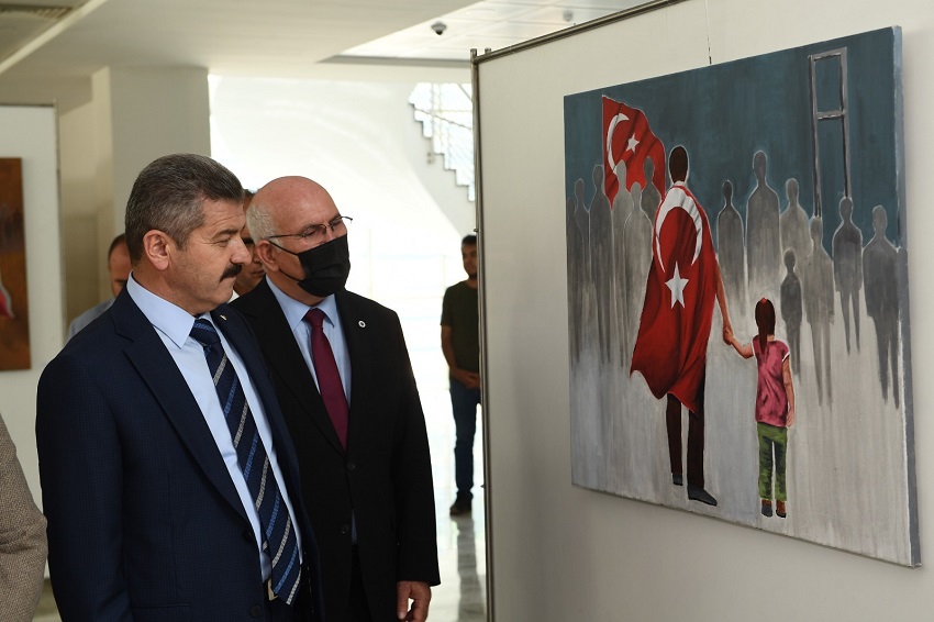 Program öncesi Uşak Üniversitesi Güzel Sanatlar Fakültesi Resim Bölümü öğrencilerinin hazırladığı 15 Temmuz Demokrasi ve Milli Birlik Günü temalı resim sergisinin açılışı gerçekleştirildi.