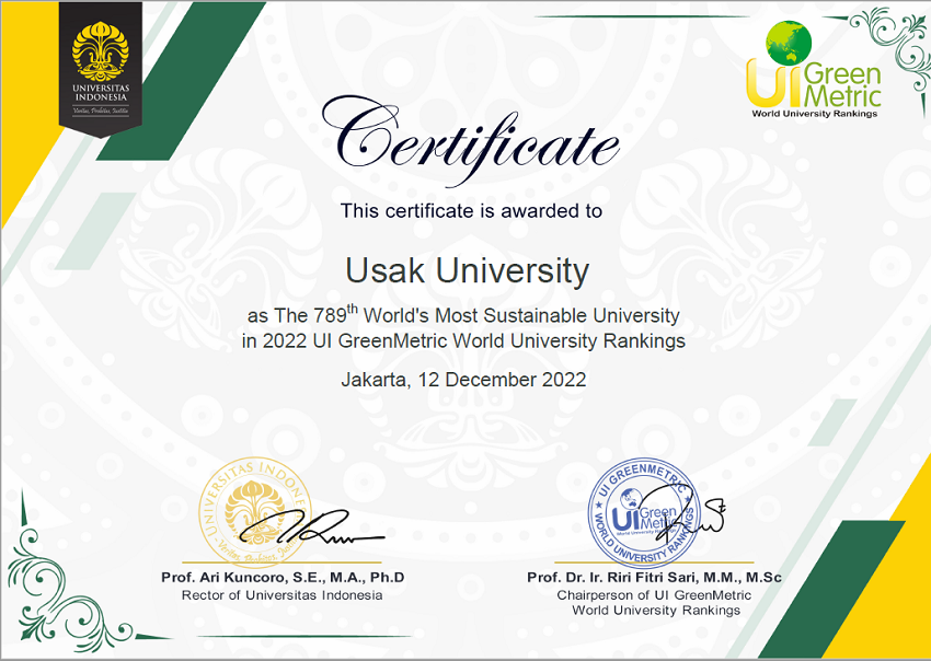 Uluslararası düzeyde 1050 üniversitenin sıralamaya dâhil edildiği değerlendirmede, 2022 yılında 789. sırada yer alan Uşak Üniversitesi, dünya üniversiteleri arasında bir kez daha yerini aldı. Sıralamanın yapı ve alt yapı kategorisinde 720 puan alan üniversitemiz, enerji ve iklim değişikliği kategorisinde 675, atık kategorisinde 525, su kategorisinde 400, eğitim ve araştırma kategorisinde 950, ulaşım kategorisinde ise 1100 puan alarak, ABD, Rusya ve Avrupa’daki birçok üniversiteyi geride bıraktı.