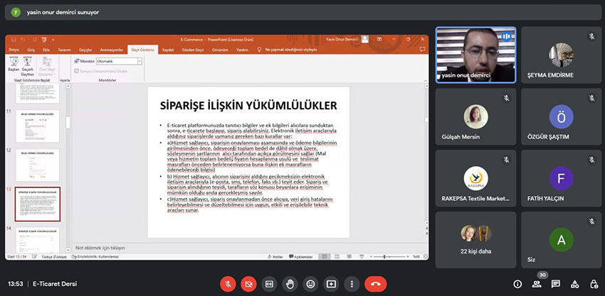 E-ticaretle ilgili hukuki düzenlemeler, e-ticaretin düzenlenmesi hakkındaki kanun ve kişisel verilerin korunması (KVKK) kanunu hakkında detaylı bilgi verilen eğitim UTTO Koordinatörü Öğr. Gör. Dr. Atike İnce Yardımcı’nın Av. Yasin Onur Demirci’ye teşekkürleri ile son buldu.