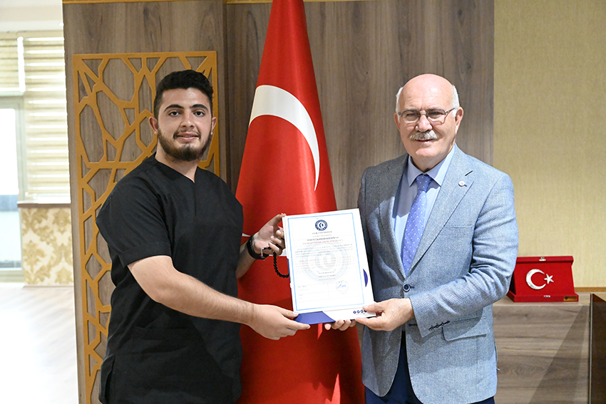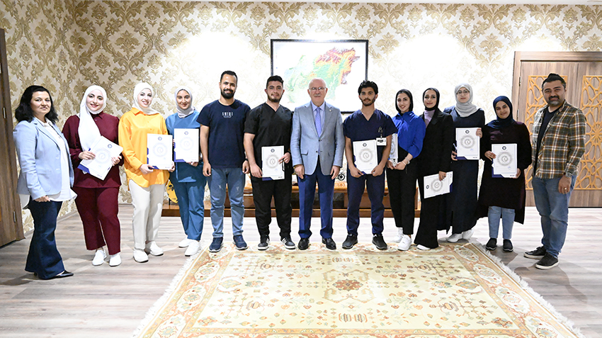Filistin’den tıp eğitimi almak için Uşak Üniversitesine gelen doktor adaylarını makamında ağırlayan Prof. Dr. Ekrem Savaş, öğrencilere katılım belgesi verip meslek hayatlarında başarılar diledi. Uşak Üniversitesinin dünyada tanınırlığının her geçen yıl daha da arttığını ifade eden Rektör Savaş, “Kalitesi hem Türkiye’deki saygın kurumlar hem de uluslararası kuruluşlar tarafından kabul görmüş üniversitemizi yerli öğrenciler kadar uluslararası öğrenciler de tercih ediyor. Geçen yıl Filistin’den 9 öğrenci gelmişti üniversitemize bu yıl ise öğrenci sayısı 10’a çıktı. Gelecek yıl bu sayının daha da artacağını düşünüyoruz.” dedi.