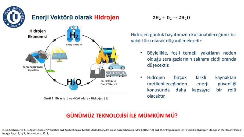 Yoğun ilgi gören konferansta Dr. Aslan yenilenebilir bir enerji kaynağı olarak görülen hidrojenin, evrende en çok bulunan bir element olmasına rağmen günümüz teknolojisinde kullanımının önemli zorluklar barındırdığından bahsetti. Yapılan araştırmaların, hidrojenin temiz ve sürdürülebilir bir alternatif enerji vektörü olduğunu göstermekte olduğunu aktaran Dr. Aslan, hidrojenin bir enerji kaynağı olarak düşünülmesi durumunda, hidrojenin taşınması, depolanması ve verimli bir şekilde kullanılması konusunda bazı temel sorunların olduğunu aktararak konuyla ilgili araştırmaları anlattı.