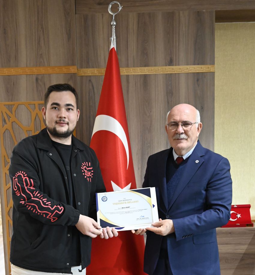 Rektör Prof. Dr. Ekrem Savaş ödül alan öğrencilerimizi makamında ağırladı.