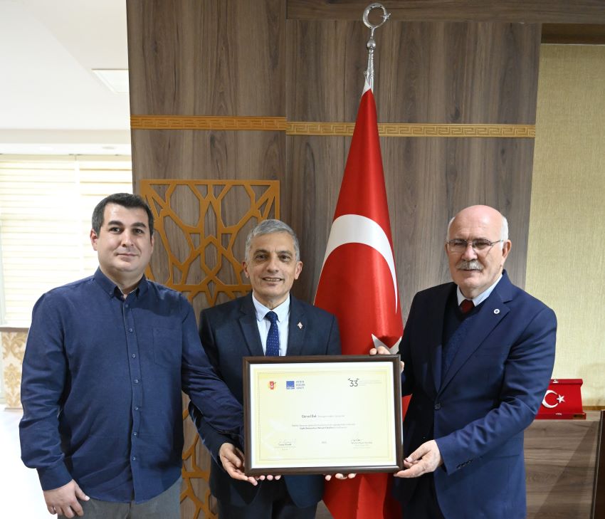 Ziyarette, İletişim Fakültesi Dekanı Prof. Dr. Murat Sezgin ve İletişim Fakültesi Radyo Televizyon ve Sinema Bölümü Öğretim Görevlisi Barış Özkaya, Rektör Prof. Dr. Ekrem Savaş’a, Uşak Üniversitesi adına kazanılan ödülü takdim ettiler.